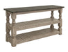 Elevate the charm of any room with our Natural Stone sofa table, showcasing timeless farmhouse style and practical functionality. Crafted from solid pine wood, it features a captivating sand drift finish that accentuates the unique natural grain patterns, complemented by a rich dark brown top for added depth. You'll love the addition of two beautiful slatted shelves, offering an ideal space for your decorations or your stack of must-reads.
